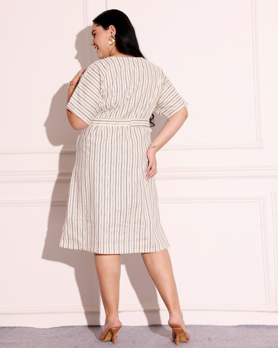 Elevate your casual style with this striped A-line midi dress. Crafted from linen, it features a flattering V-neck and short sleeves for effortless chic.