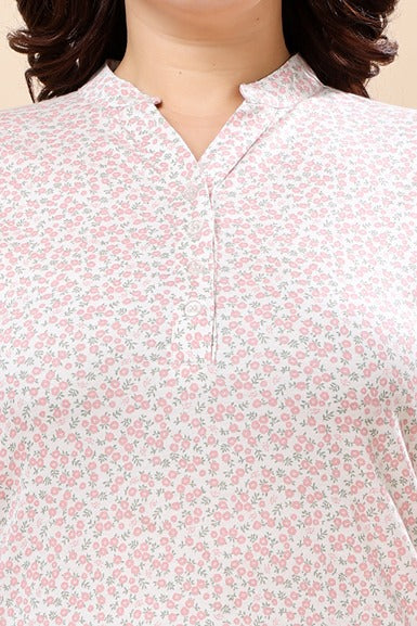 Embrace comfort with our Floral Cotton Lycra Night Suit Set. Featuring a stylish Chinese collar and pullover long top, perfect for a cozy night's sleep.