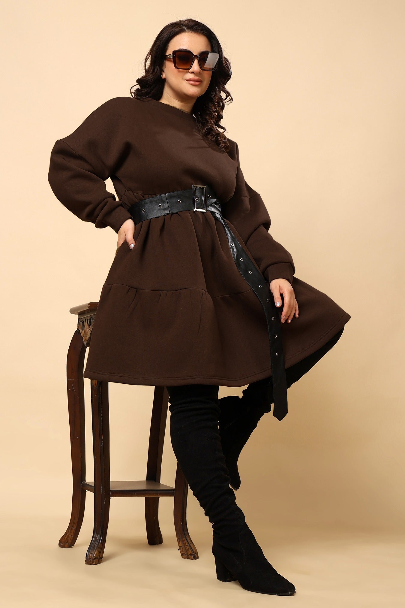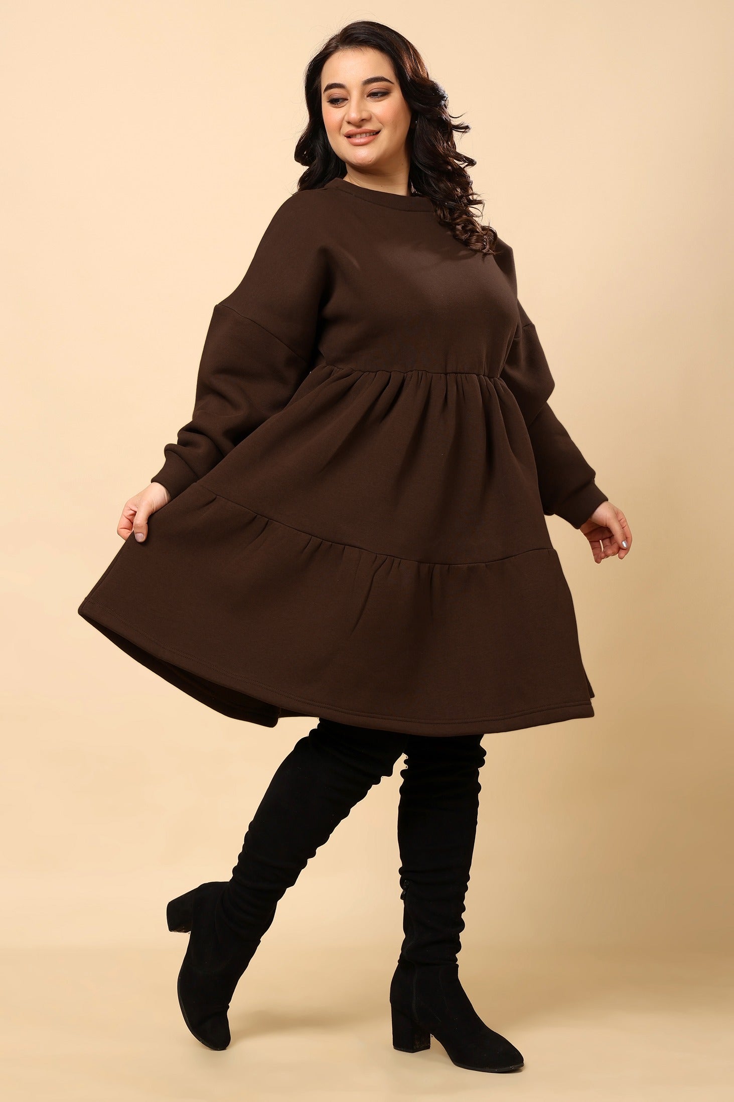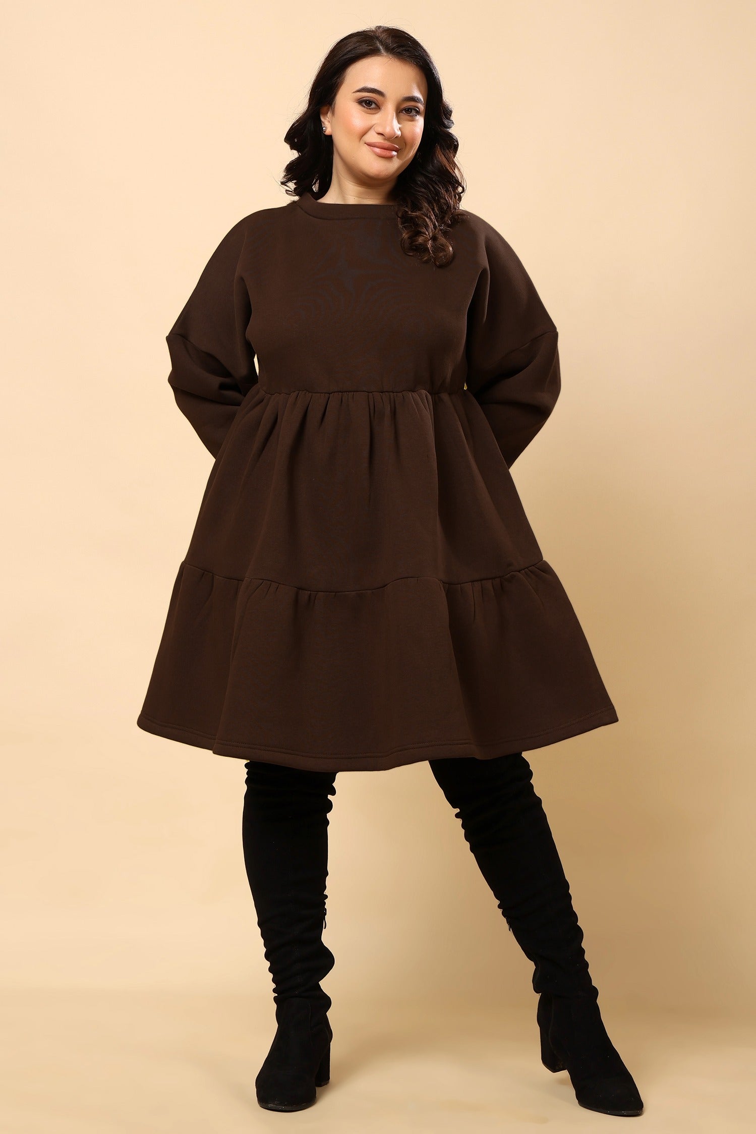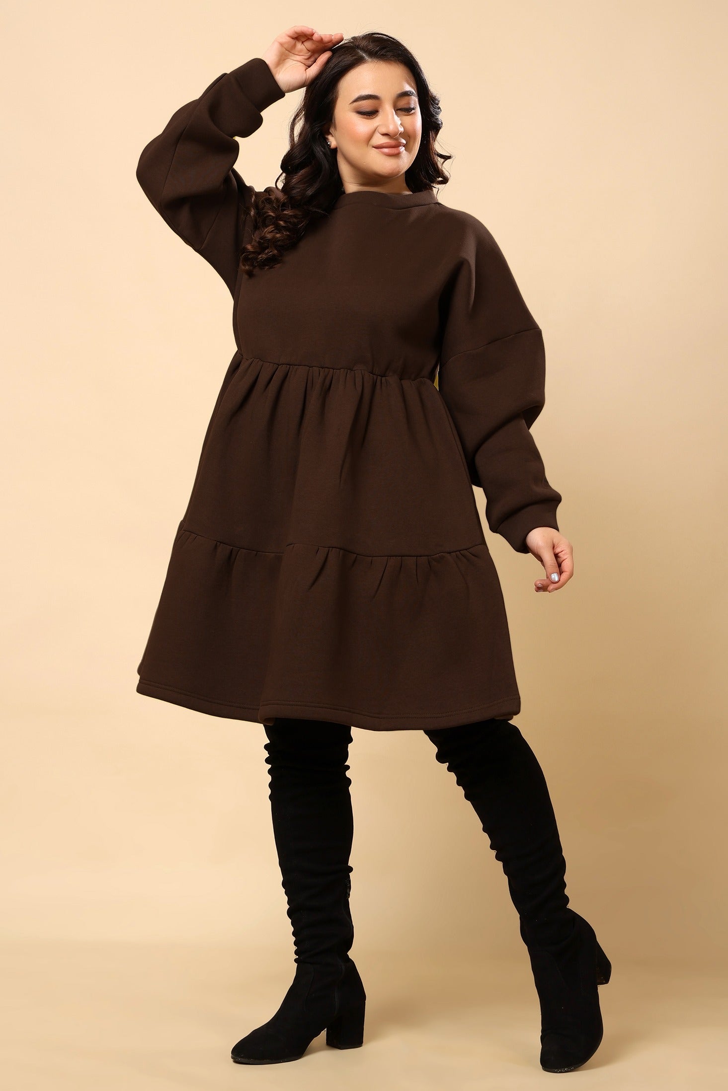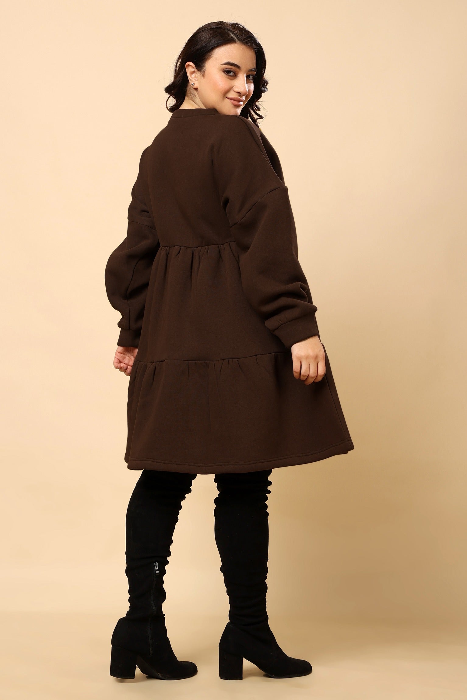 Brown Solid Frill Dress