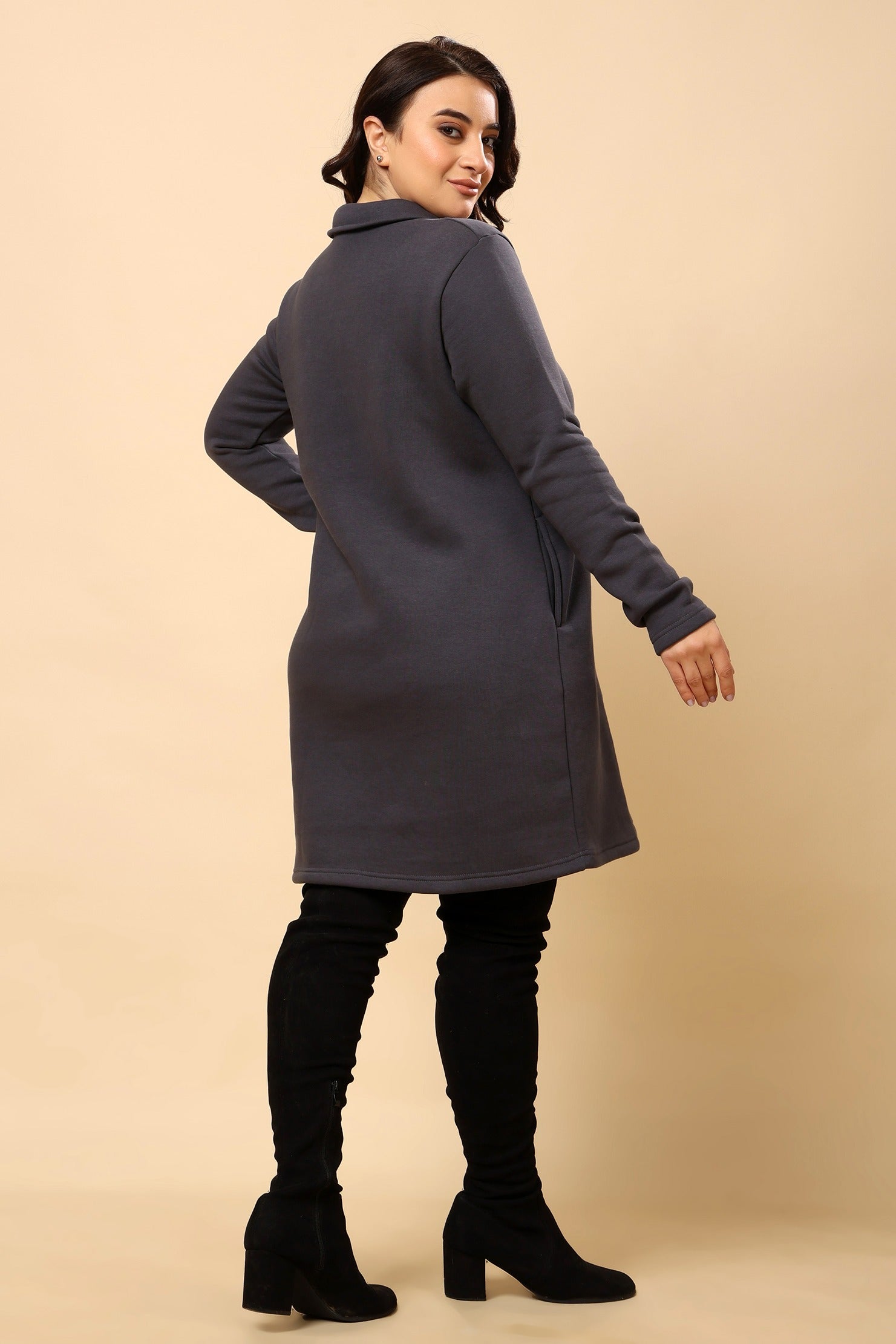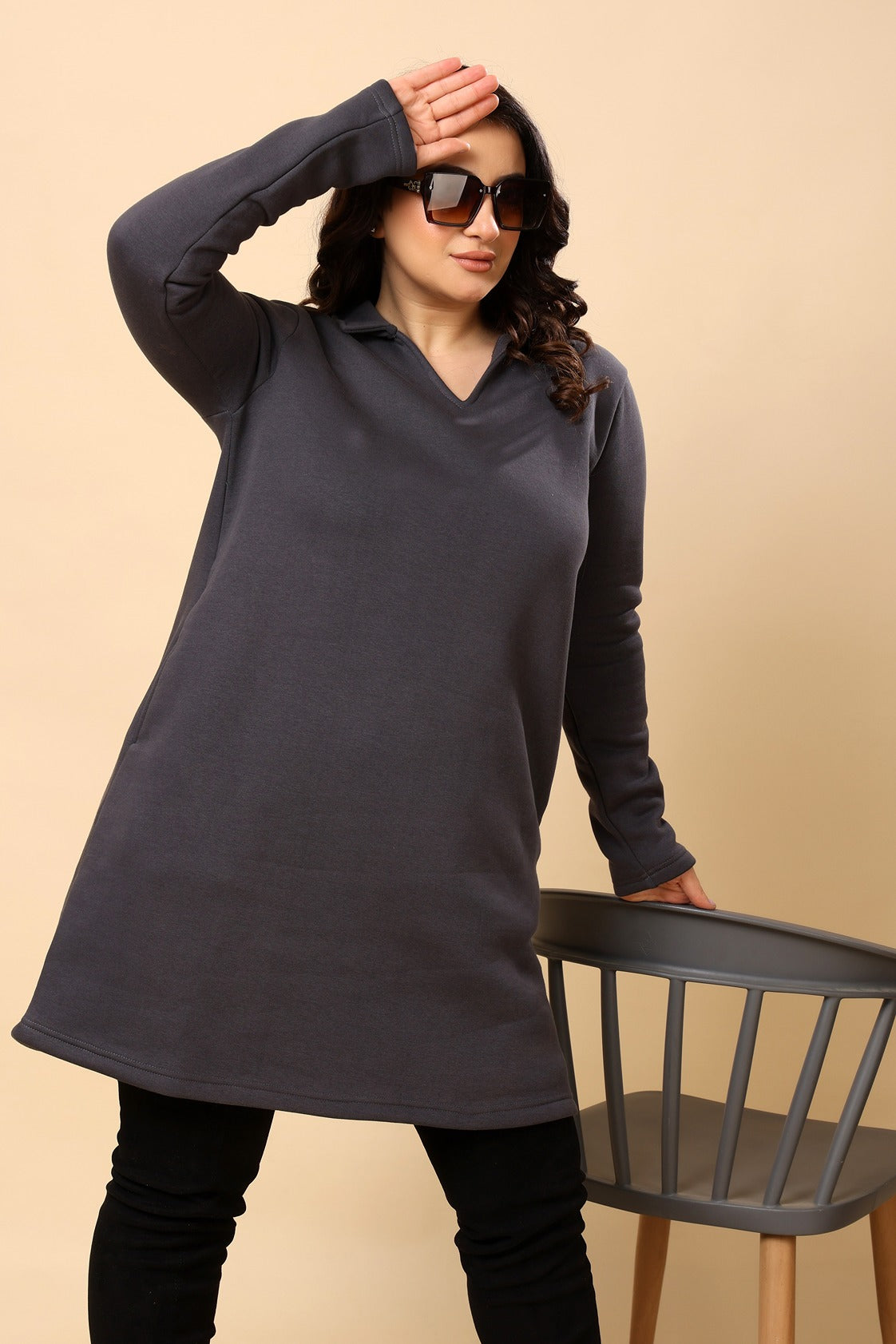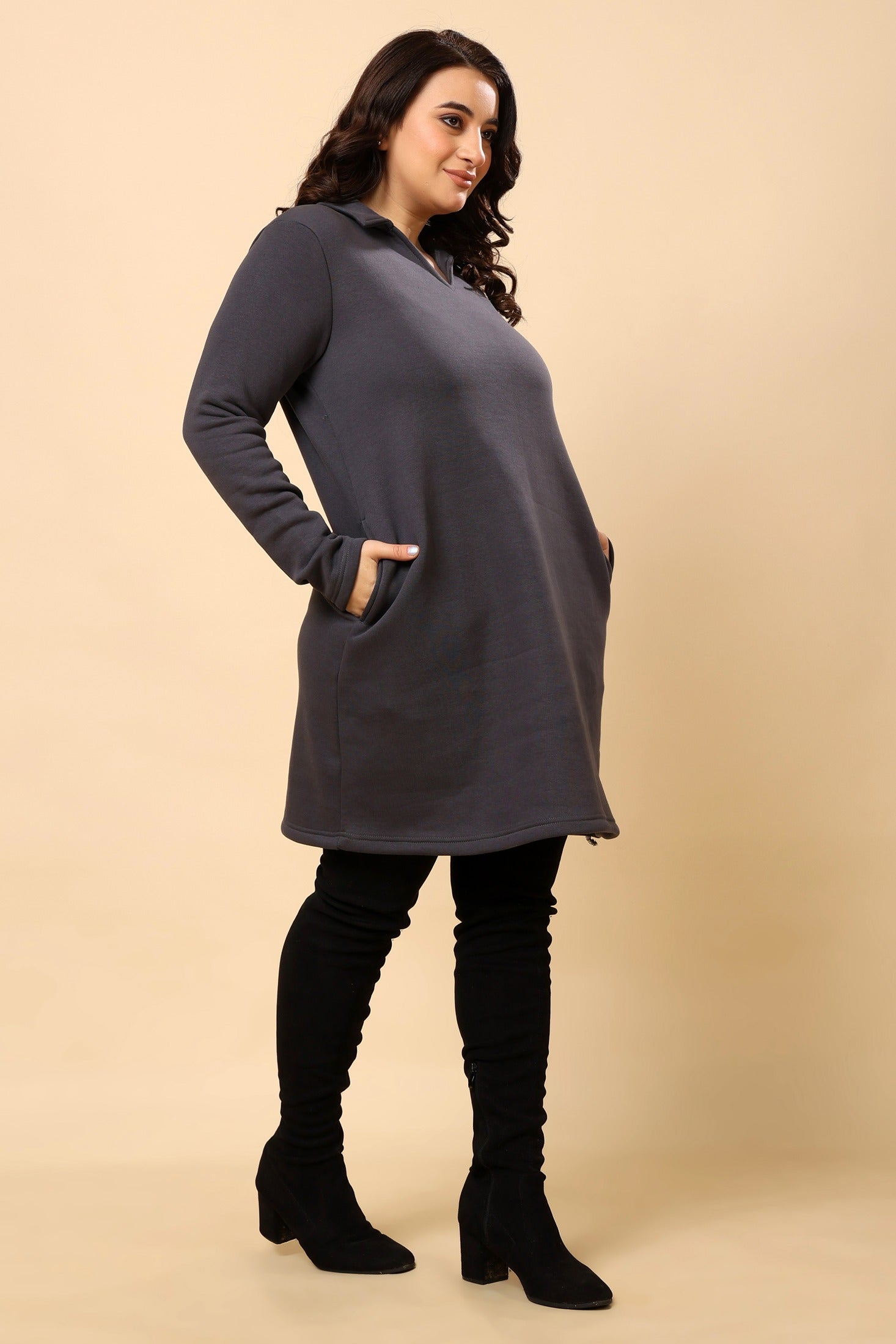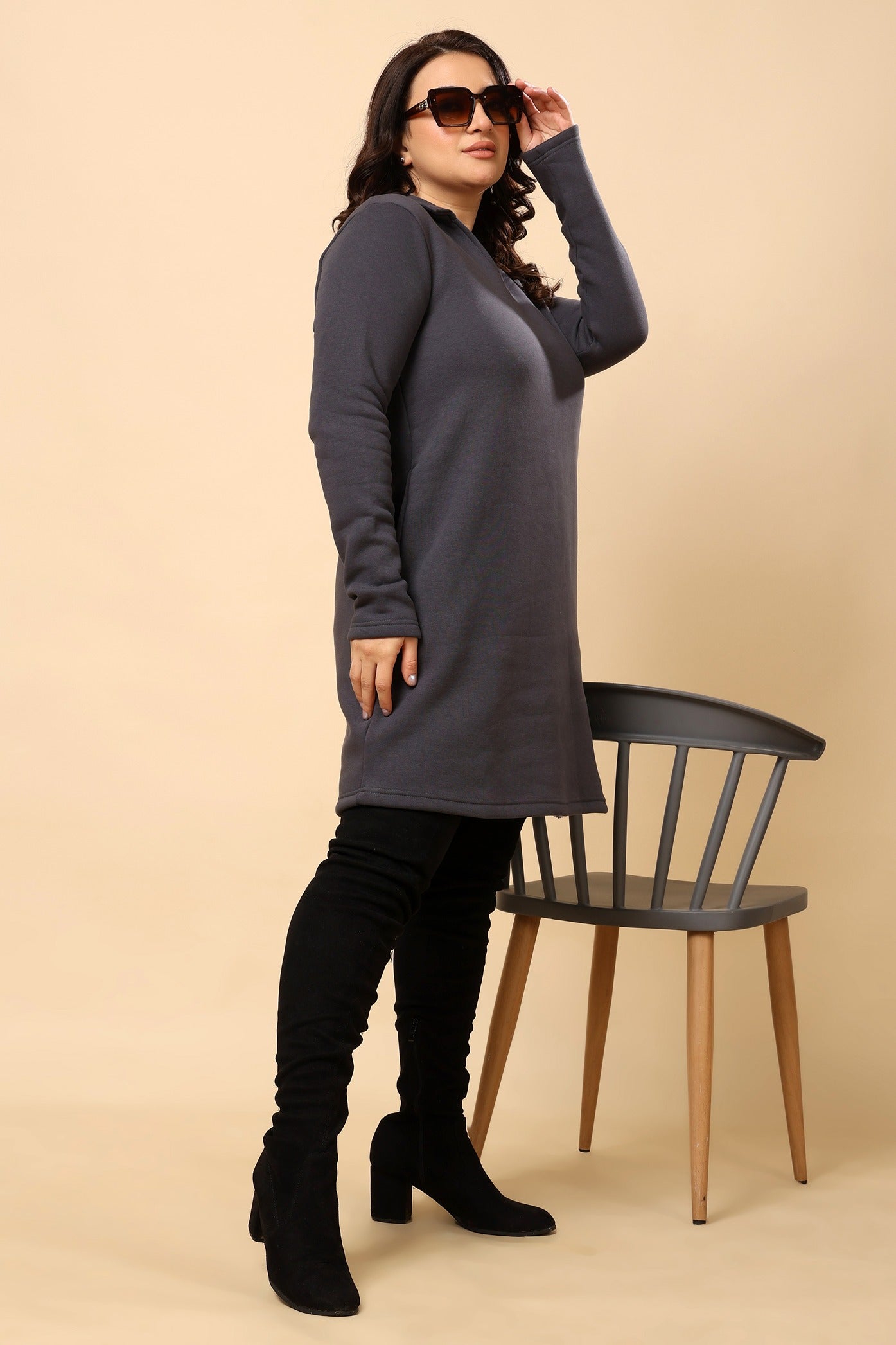 A timeless A-line dress in a deep charcoal tone, designed to drape effortlessly over the body while enhancing natural curves.