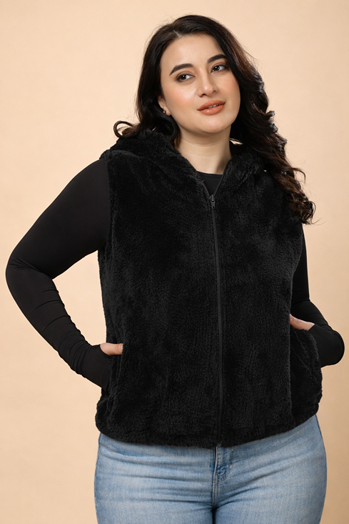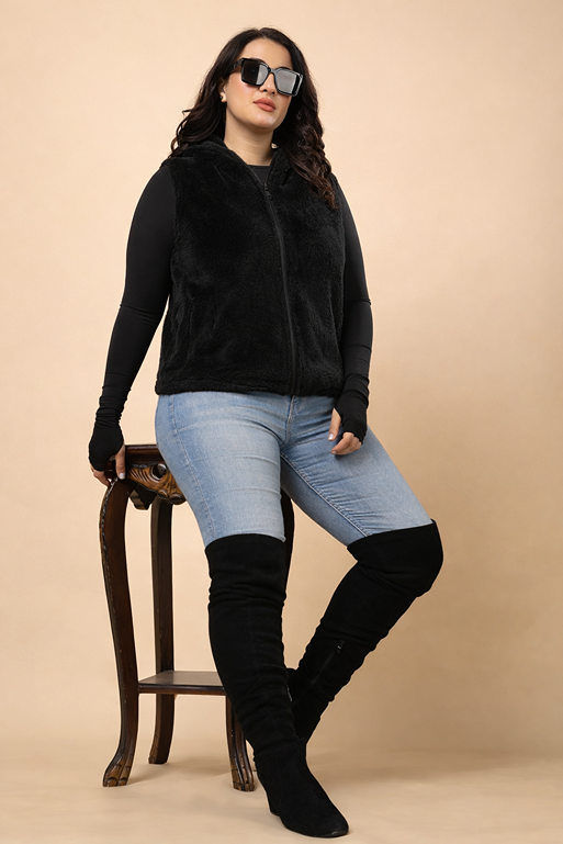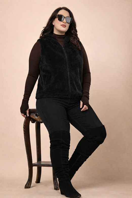 Sleeveless Solid Fur Jacket-Black