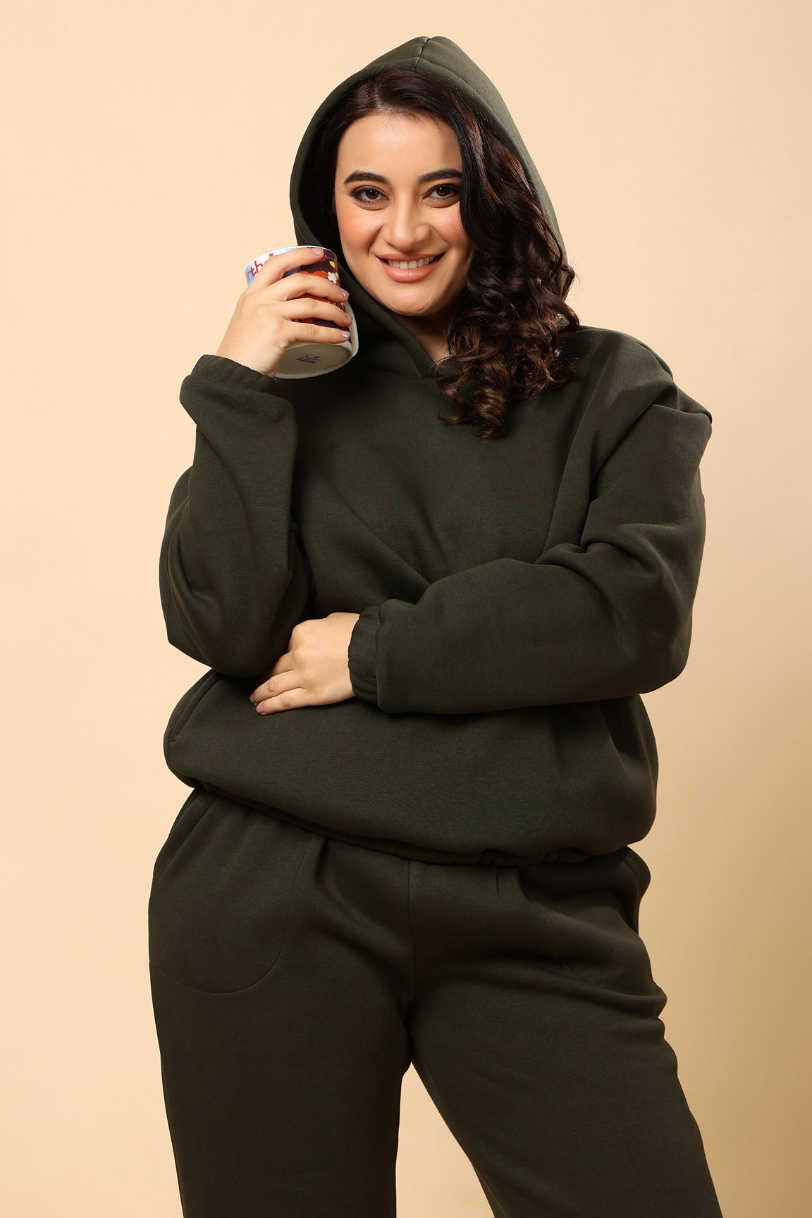 Solid Winter Sweatshirt with Hoodie- Dark Olive Green